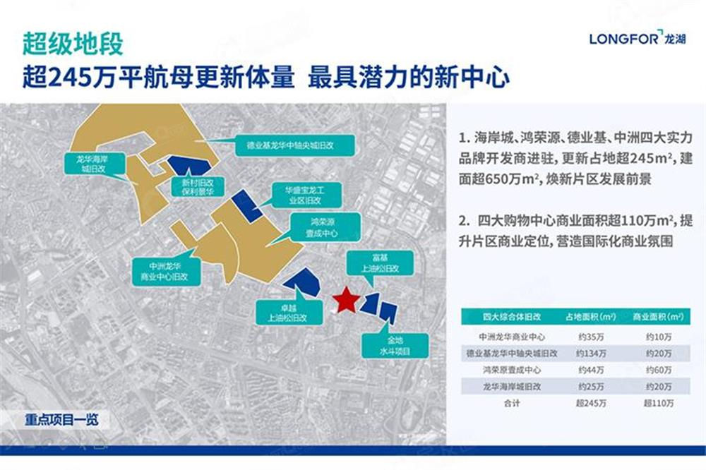 粵港澳大灣區中軸,深圳地理中心,龍華中心地段。政府約2000億元投資,近2.5倍福田中心區規模,超60個標志性重大項目,打造集高端商務、現代商貿、金融服務于一體的國際會客廳。片區規劃更新面積超245萬㎡,建面超650萬㎡,中洲、海岸、德業基、鴻榮源四大購物中心超110萬㎡集中商業建面,周邊規劃綜合體林立,定鼎深圳未來最大商圈;